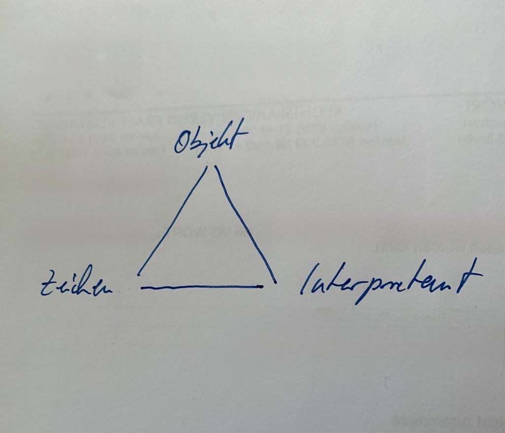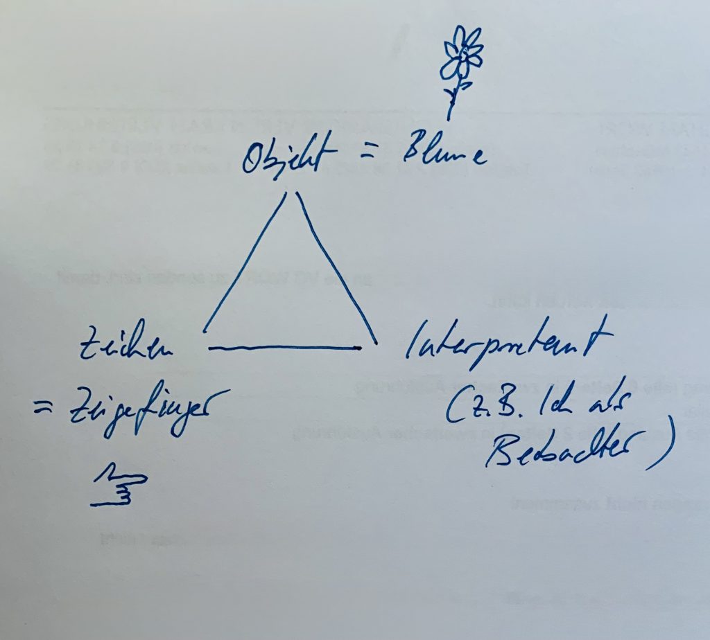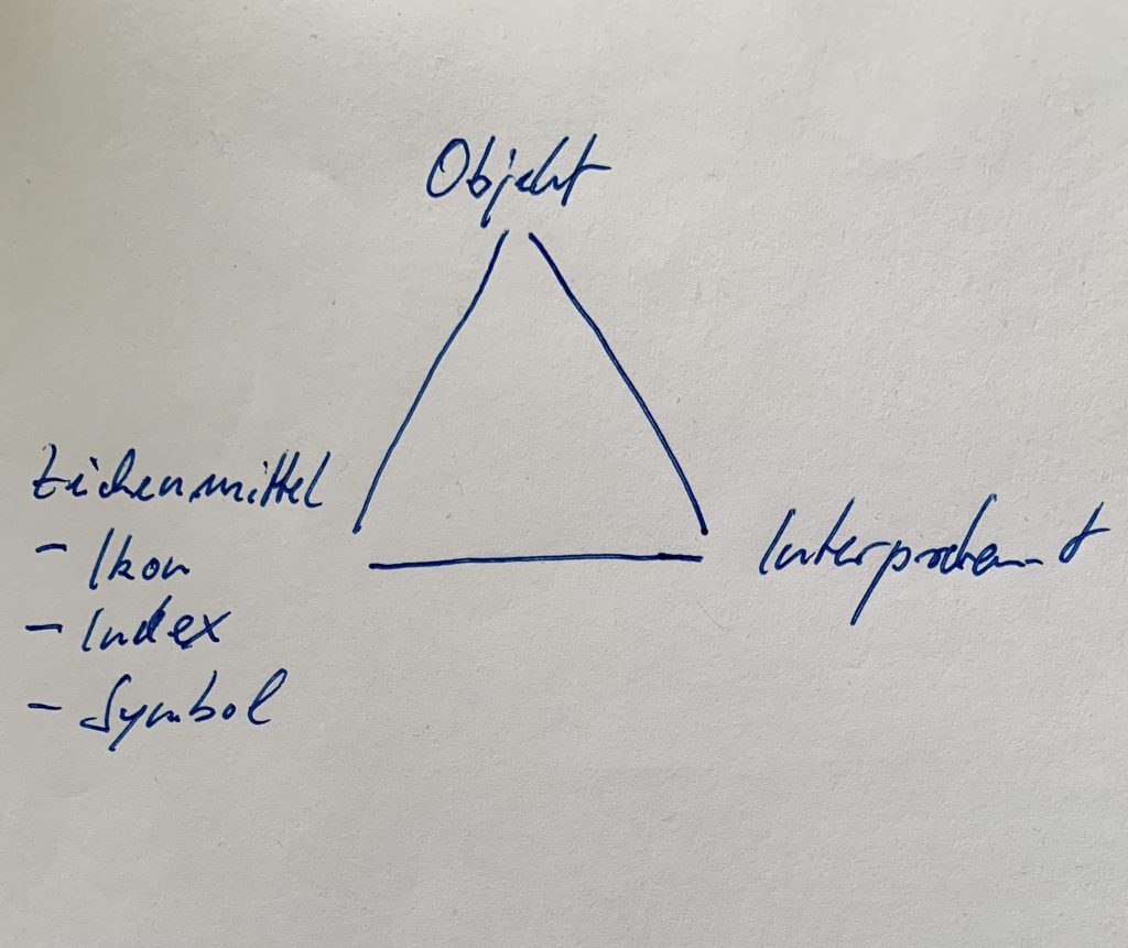Nun muss ich zeichnen, sorry, ich bin nicht geschickt darin: Das Dreieck mit Zeichen(mittel), Objekt und Interpretant. Das ist das Basisschema, das für alle denkbaren Zeichen gilt, es wird nur jeweils variiert.