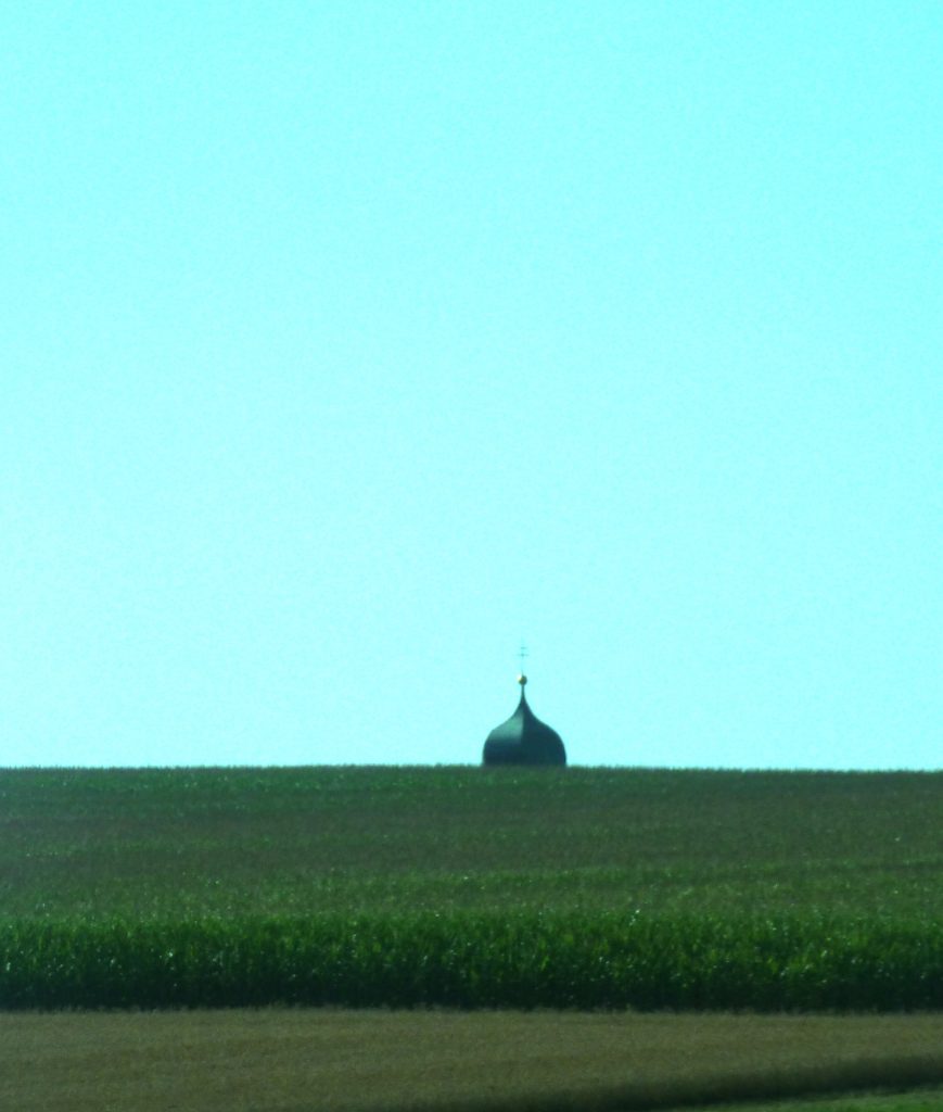 Lange Zeit bin ich mit dem Zug gependelt, bei jeder Fahrt, hin und zurück, fuhr der Zug kurz nach bzw. vor Hintertupfingen jedesmal an einer langgezogenen Anhöhe vorbei und jedesmal tauchte dort, hinter dem Hügel, auf einmal die Zwiebel eines Kirchturms auf: