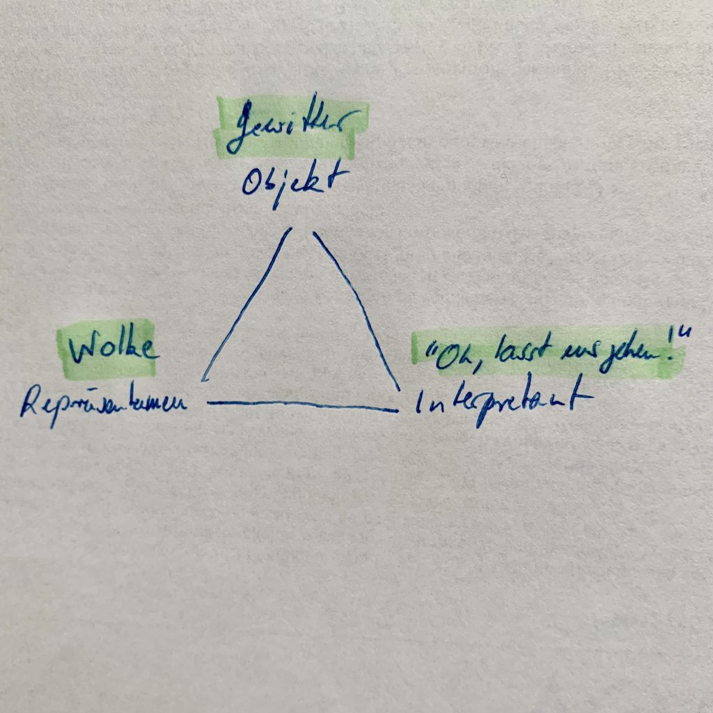 Wir verstehen: Hier ist ein Zeichen(mittel) (Repräsentamen), nämlich die dräuende Wolke, die für die Mutter auf sein Objekt, das Gewitter hinweist, und die deshalb zum Aufbruch ruft, um die Familie vor dem Gewitter in Sicherheit zu bringen (Interpretant).