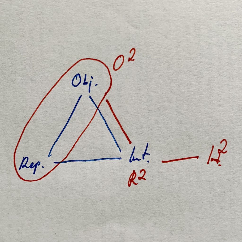 Diesmal also nicht: Der Interpretant rückt an die Stelle von R, sondern R und Objekt verschmelzen zu einem neuen Objekt, wodurch der Interpretant quasi automatisch an die Position des R gezogen wird. (– und zur Re-Komplettierung des Zeichens einen neuen Interpretanten braucht.)